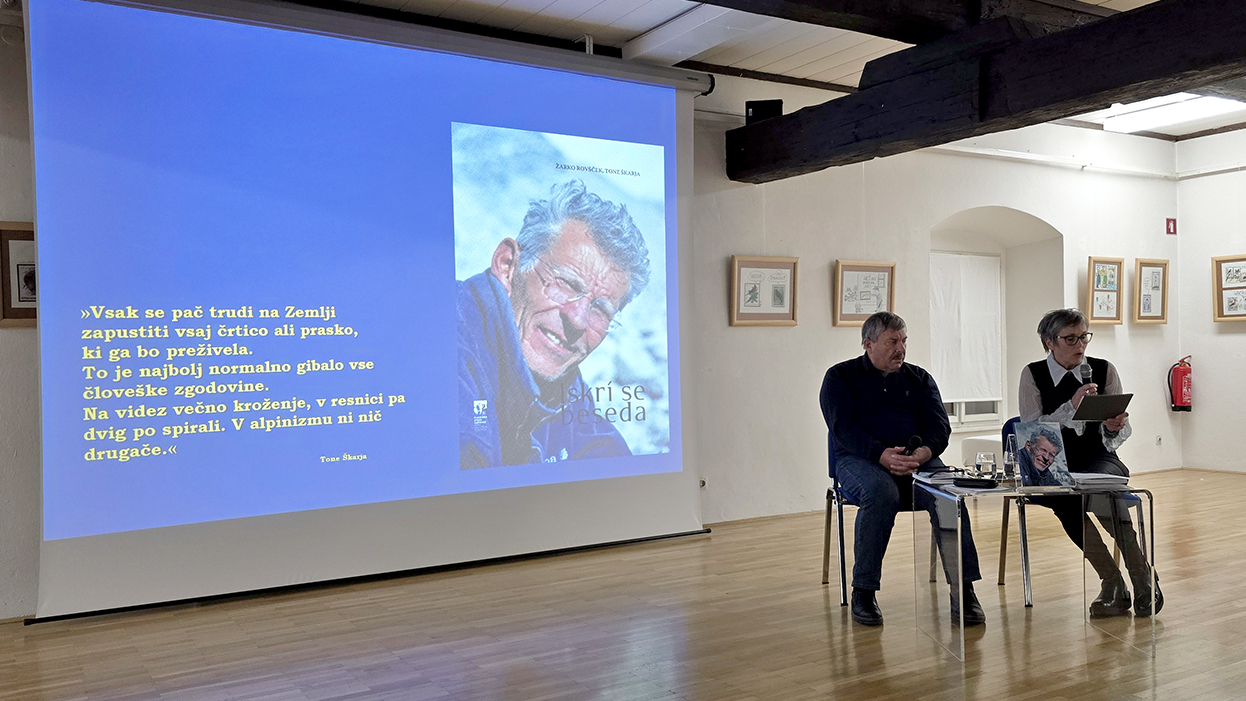 Še pred pogovorom o knjigi je zbrane v galeriji nagovoril vodja slovenskega predsedovanja Alpski konvenciji, Emil Ferjančič. Osrednji del zanimivega večera je bil namenjen pogovoru s publicistom Žarkom Rovščkom, ki ga je vodila Anka Rudolf. Gost je predstavil zahtevno izbiranje Škarjevih besedil, ki so razsejana v različnih tiskih. Knjiga je zasnovana v dveh delih. Približno polovico njenega obsega je uredniška spremna beseda, v kateri je za proučevalce Škarjevega opusa dragocena točna navedba, večinoma pa tudi komentar in razprava o njegovih člankih. Druga polovica je izbor 60 člankov, ki so bili objavljeni v slovenskem tisku. Največ, kar tretjina, jih je iz Planinskega vestnika, v katerem je Tone Škarja kot pisec začel in še skoraj tik pred slovesom tudi zaključil svojo publicistično pot. Ostali dve tretjini predstavljajo članke iz časopisa Delo, Alpinističnih razgledov, Grifa, Obvestil PZS in drugih. Izbor je zaključen z drobci iz Škarjevih intervjujev. Knjiga je tudi bogato likovno opremljena. K izjemni vrednosti pa zagotovo pripomorejo tudi obširni podnapisi k fotografijam, sprotne opombe in popolno kazalo.